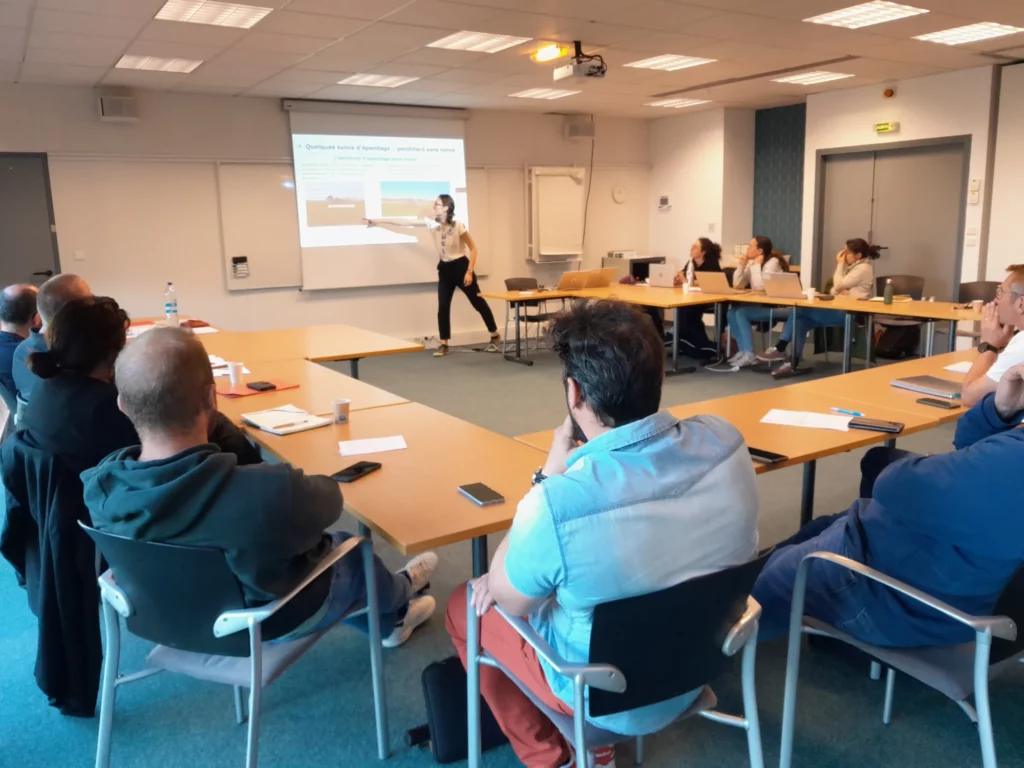 Tout au long du projet, des actions sont menées afin de sensibiliser les agriculteurs à la thématique de l’ammoniac et de la qualité de l’air. Cela se concrétise par des participations à des évènements agricoles tels que le SPACE ou les Méca Innov mais également lors de démonstrations de matériels d’épandage.